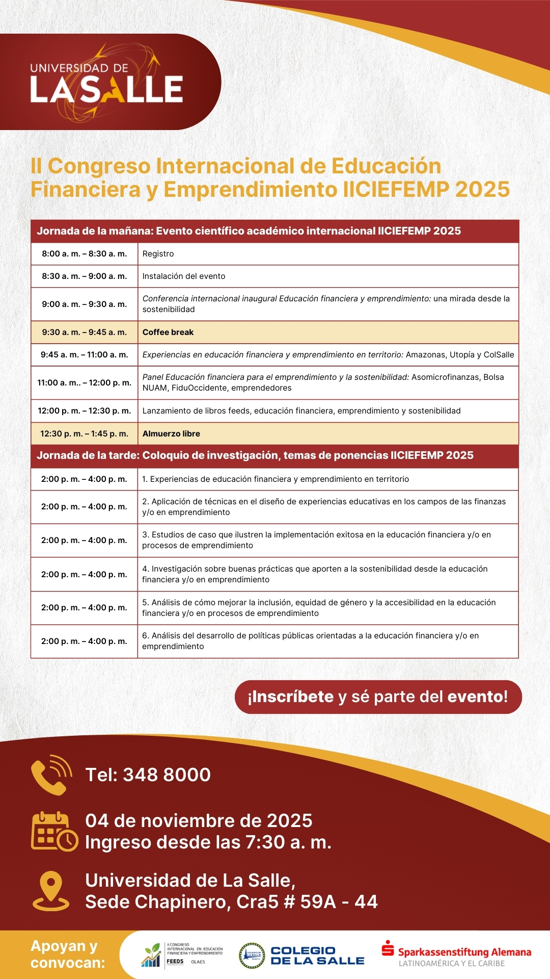 La Facultad de Economía, Empresa y Desarrollo Sostenible de la Universidad de La Salle te invita a participar en el II Congreso Internacional de Educación Financiera y Emprendimiento (IICIEFEMP 2025), un espacio académico que reunirá a investigadores, docentes, estudiantes y emprendedores para reflexionar sobre la educación financiera como motor de transformación social y sostenibilidad. Este evento contará con conferencias internacionales, paneles de expertos y experiencias en territorio, además de un coloquio de investigación orientado a fortalecer el conocimiento y las buenas prácticas en educación financiera y emprendimiento.